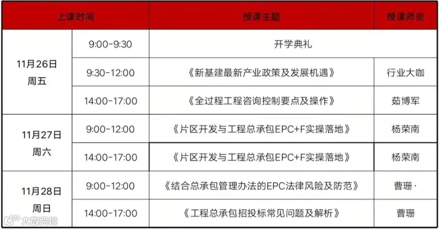各位同学,您好!《新基建下EPC工程总承包与全过程工程咨询实战型高级研讨班 第62期》,定于2021年11月26日-28日杭州开课。请您合理安排时间,提前联络教务老师,按时上课。