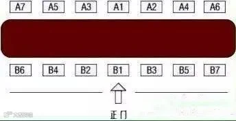 有时候,我们为了更加突出1号领导,主席台人数是偶数时,往往也把1号领导往中间排,即使主席台显得不够对称。我们暂且称之为“相对居中”。如下图就是把1号领导的位置作了“相对居中”摆放。