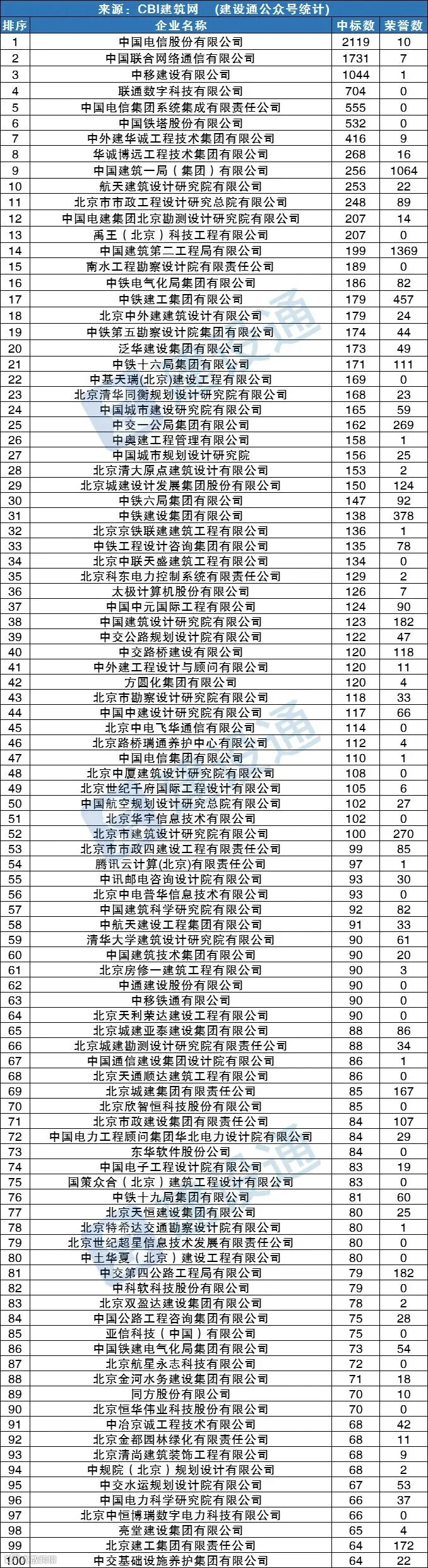 CBI建筑网综合报道:在2021年,北京建筑施工企业中标数量达27770项,同比(与去年同期)上升3.78%。其中,中国电信股份有限公司、中国联合网络通信有限公司、中移建设有限公司分列中标数量排行榜前三位。