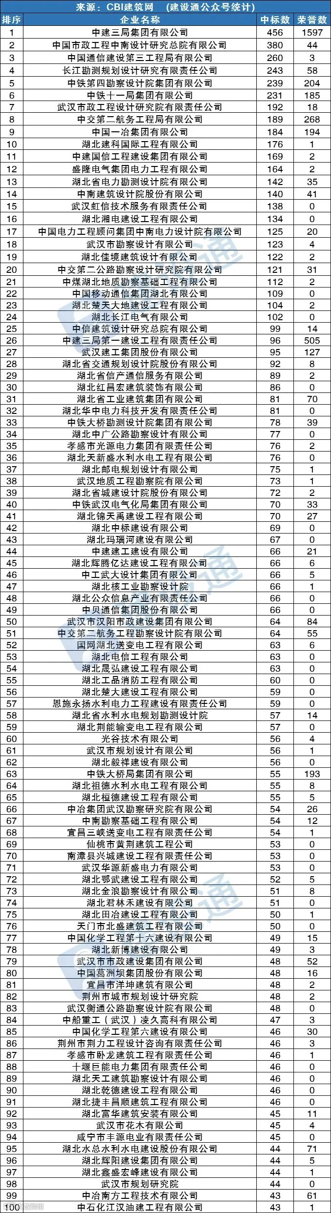 CBI建筑网综合报道:在2021年,湖北建筑施工企业中标数量达62617项,同比(与去年同期)上升0.56%。其中,中建三局集团有限公司、中国市政工程中南设计研究总院有限公司、中国通信建设第三工程局有限公司分列中标数量排行榜前三位。