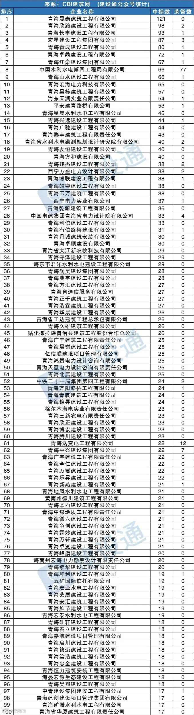 CBI建筑网综合报道:在2021年,青海建筑施工企业中标数量达12090项,同比(与去年同期)下降14.49%。其中,青海晟泰建筑工程有限公司、青海欣路建设工程有限公司、青海长丰建设工程有限公司分列中标数量排行榜前三位。