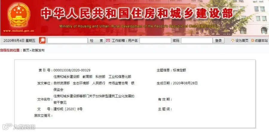 2020年9月4日住建部官网发布《住房和城乡建设部等部门关于加快新型建筑工业化发展的若干意见》,以新型建筑工业化带动建筑业全面转型升级,打造具有国际竞争力的“中国建造”品牌。《意见》明确提出: