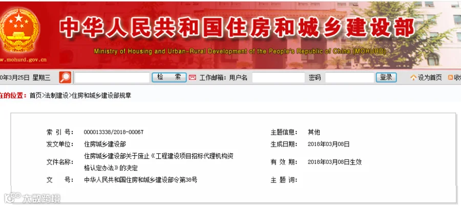 2018年3月8日住建部发布关于废止《工程建设项目招标代理机构资格认定办法》,招标代理机构资格被废止。