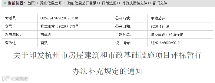 为进一步优化营商环境,规范和完善我市房屋建筑和市政基础设施项目招标评标活动,引导建筑行业可持续健康发展,根据《关于进一步加强房屋建筑和市政基础设施工程招标投标监管的指导意见》(建市规〔2019〕11号)、《房屋建筑和市政基础设施项目工程总承包管理办法》(建市规〔2019〕12号)、《关于推进全过程工程咨询服务发展的指导意见》(发改投资规〔2019〕515号)文件精神,现就《杭州市房屋建筑和市政基础设施项目评标暂行办法》(杭建市[2019]393号)作出如下补充规定:
