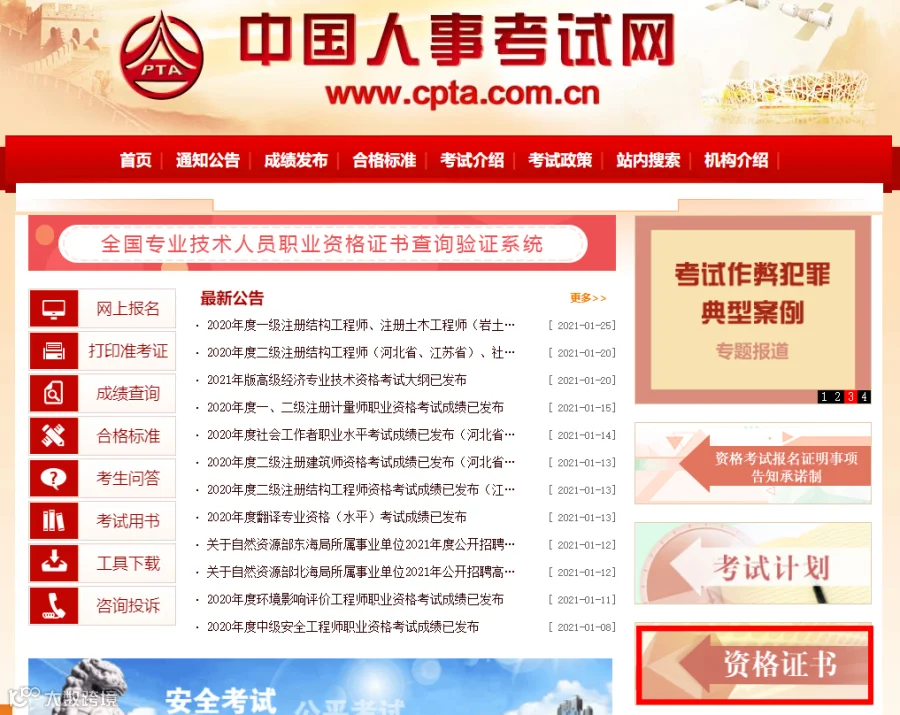 ①进入中国人事考试网,点击“资格证书”。