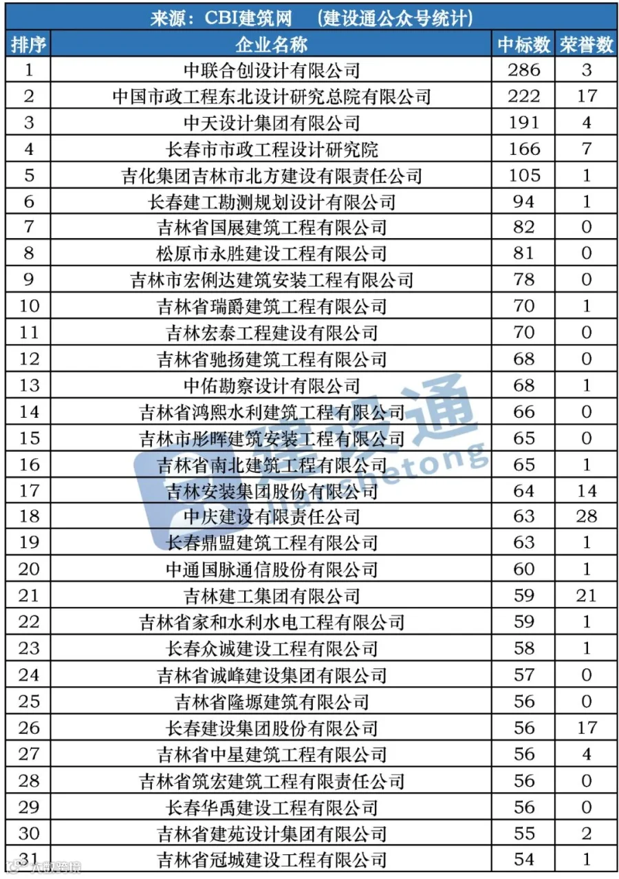 CBI建筑网综合报道:在2020年,吉林建筑施工企业中标数量达18965项,同比(与去年同期)上升24.12%。其中,中联合创设计有限公司、中国市政工程东北设计研究总院有限公司、中天设计集团有限公司分列中标数量排行榜前三位。
