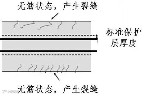 2、保护层过大,使得混凝土处于无筋状态,产生裂缝。