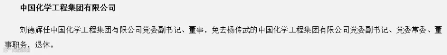 刘德辉任中国化学工程集团有限公司党委副书记、董事,免去杨传武的中国化学工程集团有限公司党委副书记、党委常委、董事职务,退休。