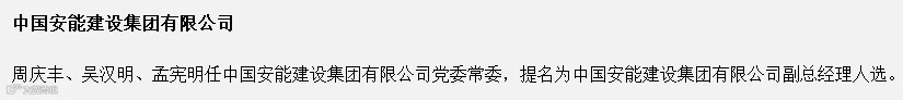 周庆丰、吴汉明、孟宪明任中国安能建设集团有限公司党委常委,提名为中国安能建设集团有限公司副总经理人选。