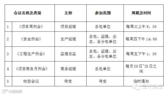 2)各类动态会议制度视项目需要随时召开,一般情况下发起方将通过有效方式至少提前一天通知相关方。凡无故迟到者、无故缺席者进行处罚(有详细处罚标准)。分包单位主要管理人员如遇到特殊情况无法参加的会议的,需向总包项目经理提交纸质假条。