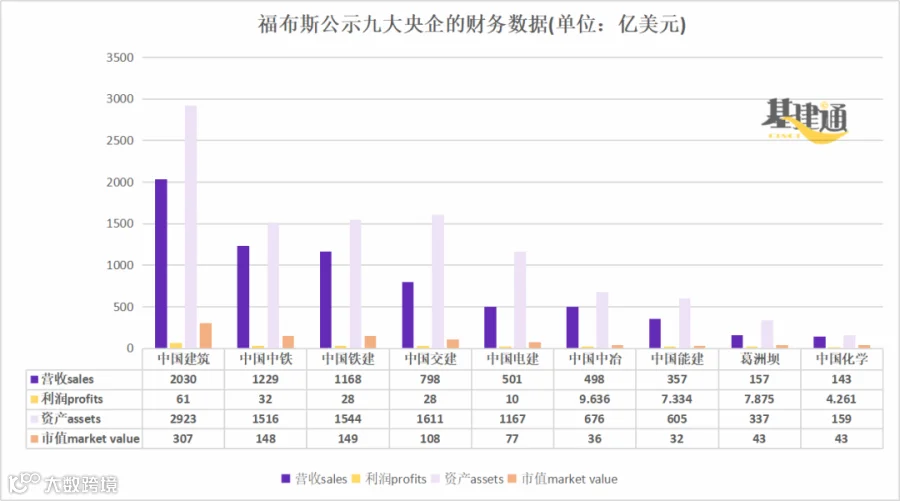 福布斯全球上市企业2000强榜单分析了企业销售额、利润、资产和市值,依据此四项标准的加权平均进行排名。以下是其公示九大央企的财务数据: