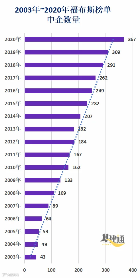 由图表可知,中国企业在全球上市公司2000榜单中数量逐年上升,呈现完美“倒梯形”的形态。17年匆匆逝去,数量也从“43”更新为“367”,数据实现8.5倍的增长着实令人惊人,又一次展现了“中国速度”!