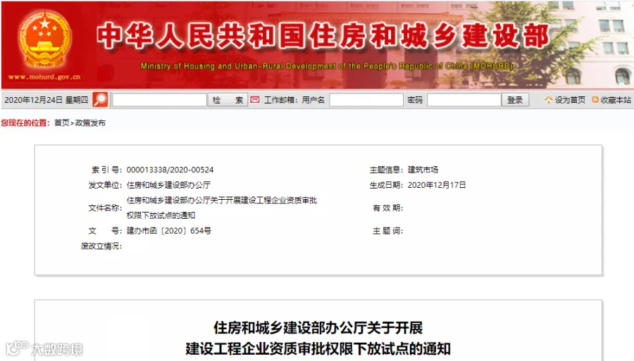 刚刚,住房和城乡建设部办公厅发布《关于开展建设工程企业资质审批权限下放试点的通知》。