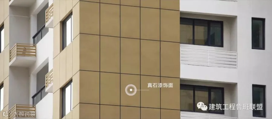 ☛ 建筑外墙为黄色、白色与灰色真石漆饰面