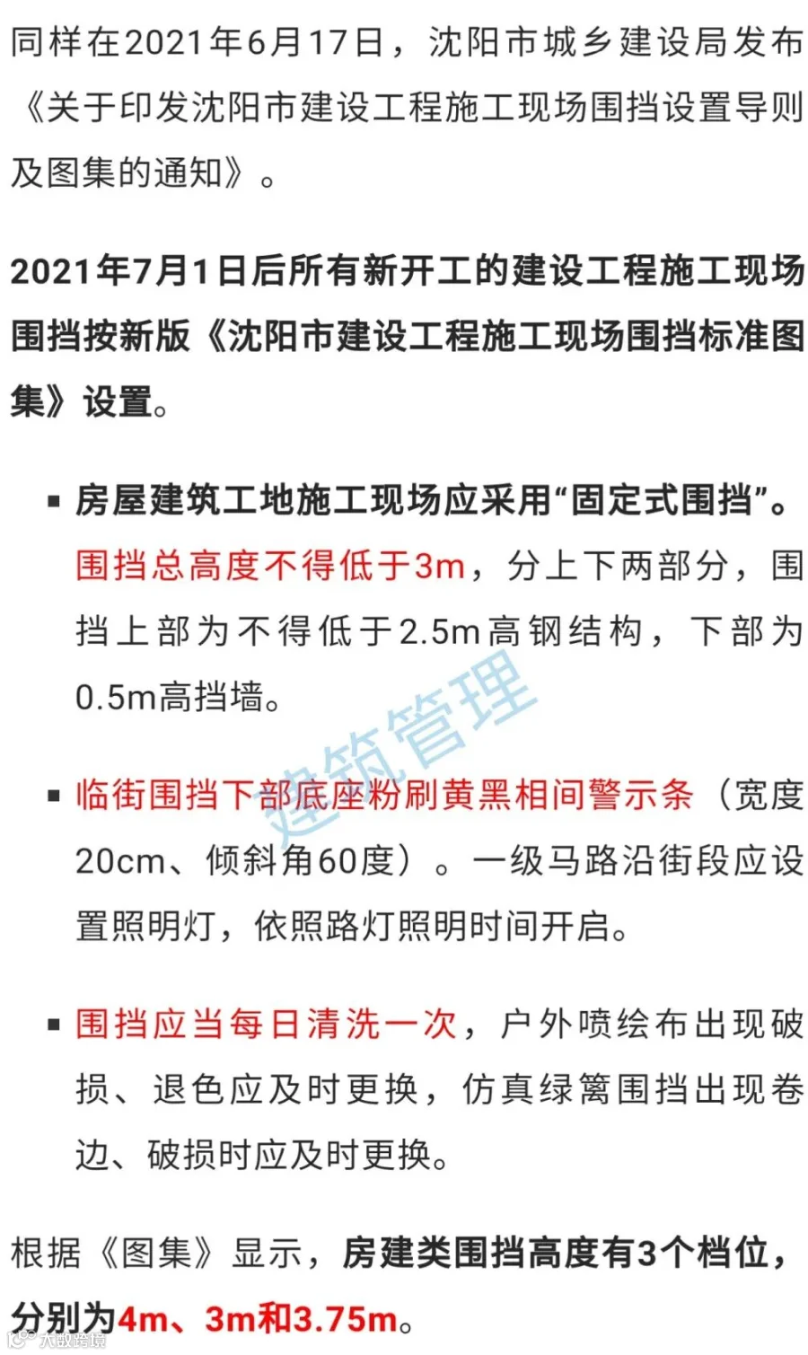 沈阳要求所以房建类围挡不得低于3米,按照图集的3个档位来设置,分别为4m、3m和3.75m,2021年7月1日起执行。