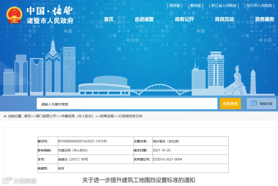 近期,浙江省诸暨市住建局发布《关于进一步提升建筑工地围挡设置标准的通知》。明确:城区建成区范围内房建项目建筑工地的围挡高度不低于5米。据小编所知,应该属于最高标准了。