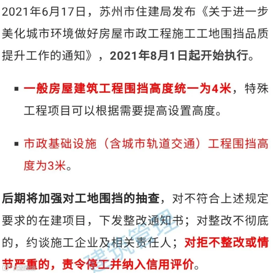 苏州要求房建工程围挡高度统一设置4米,2021年8月1日起执行。