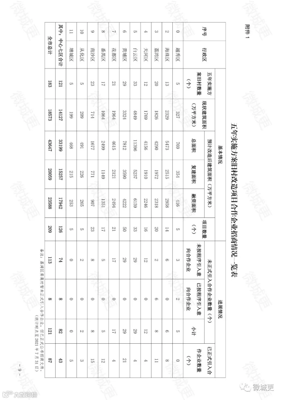 其中中心 7 区(指越秀、海珠、荔湾、天河、番禺、花都、白云区,下同)涉及的 126 个项目,已引入合作企业的项目共 43 个,引入率 34.1%;暂未引入合作企业的项目 83个(其中已按公开程序确定意向合作企业的项目 8 个,详见附件 1)。