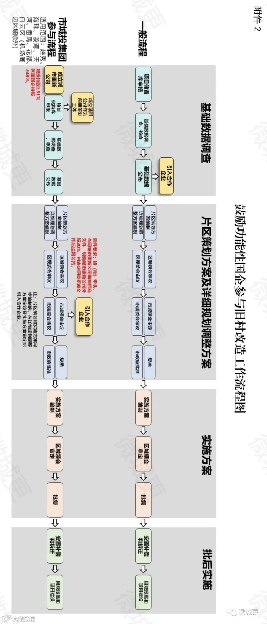 对于黄埔、南沙、增城、从化区四区旧村改造项目,也可由市城投集团独资或与区属国有企业合资成立的城市更 新公司负责一级开发,参与二级开发。
