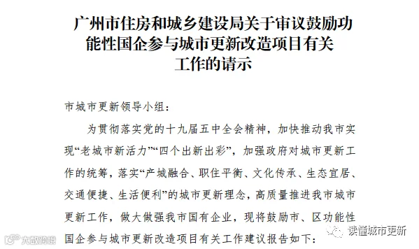 近日,一份名为《广州市住房和城乡建设局关于审议鼓励功能性国企参与城市更新改造项目有关工作的请示》的文件流出,文件中心思想:鼓励市、区国企参与旧村改造。