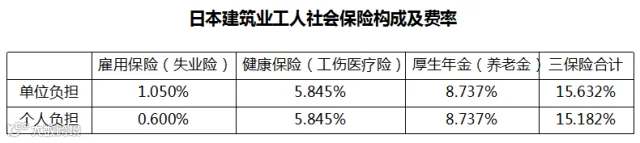 日本建筑业从业人员三种保险的缴纳费用,由公司与个人各自缴纳月收入的15%左右 。