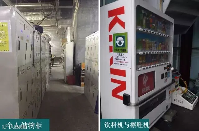 工地现场入口有专门的更换作业装备的场所,休息区还有个人储物柜,工人无需自带工具前往。