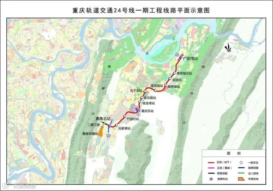 项目概况:重庆轨道交通24号线一期工程起于巴南区鹿角北站,经重庆东站、迎龙,止于南岸区广阳湾站。线路全长18.9km,设站12座,均为地下站,平均站间距1.72km;其中换乘站3座,分别与6号线重庆东站延伸段、8号线、20号线、27号线形成换乘。一期均为地下敷设,车站均为地下站。本工程采用As车6辆编组,设计时速为100km/h。