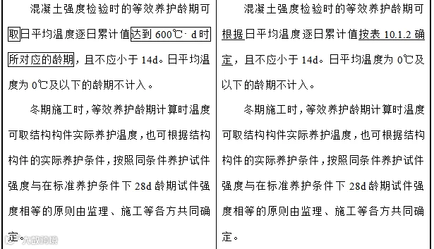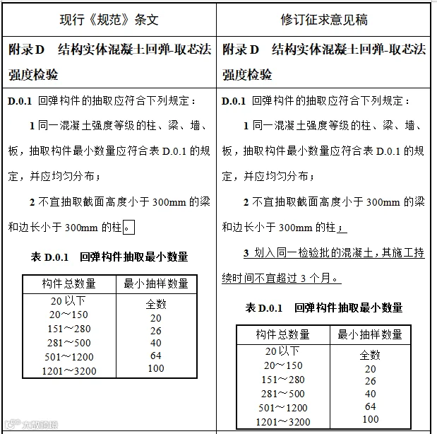同时还有些细节需要注意,如回弹取芯划分检验批时,本次修订明确规定当检测构件划分为同一检验批时,施工间隔时间不允许超过3个月。实体同条件养护不再使用600°天说法。