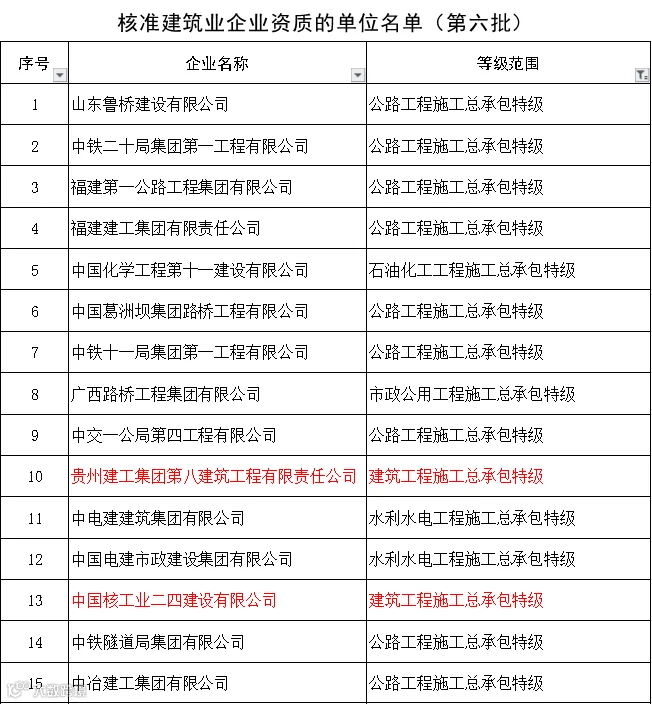 此前,住建部已公布六批资质核准名单,20家企业获得特级资质,名单如下: