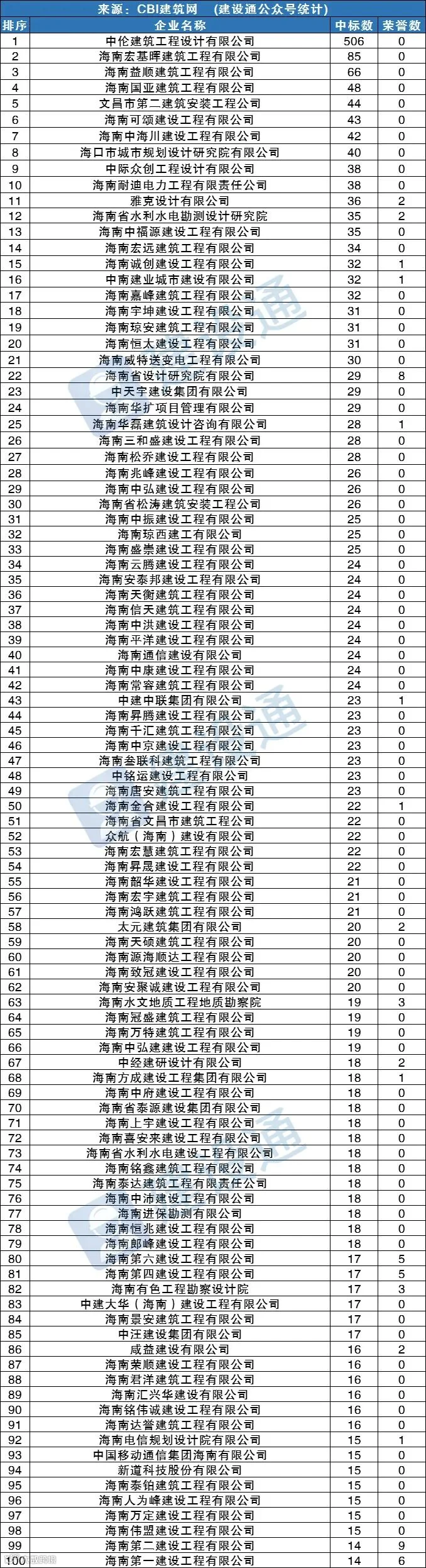 CBI建筑网综合报道:在2021年,海南建筑施工企业中标数量达7889项,同比(与去年同期)上升2.23%。其中,中伦建筑工程设计有限公司、海南宏基晖建筑工程有限公司、海南益顺建筑工程有限公司分列中标数量排行榜前三位。