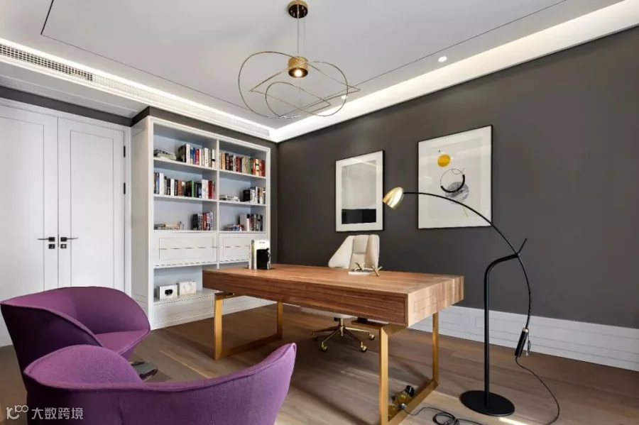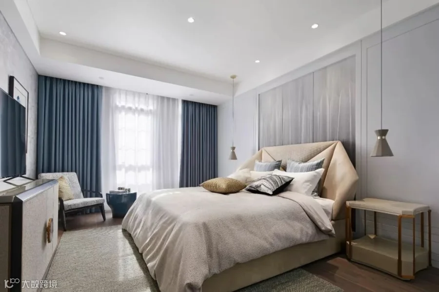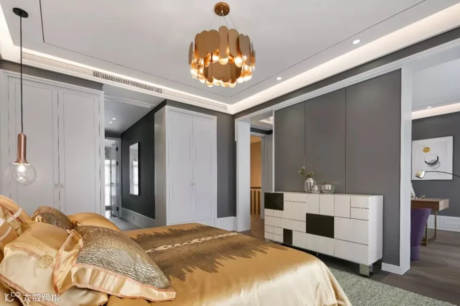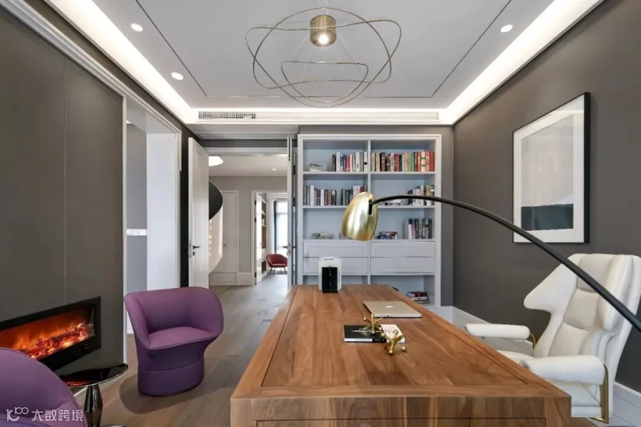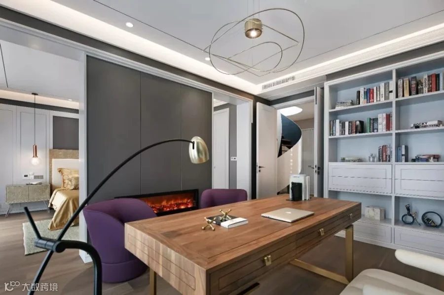 踩着胡桃木的楼梯,来到三楼。主卧套房中,一面壁炉将卧区和坐区分开,但又隔而不断。坐区雅致中带着华丽,一对紫色的椅子挑起了空间的浪漫氛围,一条钓鱼灯舒展开来,让书桌上多了几分俏皮;卧区去除了冗余的装饰,以简约为美,仅点缀几款精致的灯饰,却给人一种无与伦比的视觉享受。量身定制的床品舒适雅致,衣帽间空间充沛,卫生间明亮整洁,温和而宁静的空间让这里流淌静谧安逸的氛围。梦香,或许便是卧室设计的极致。
