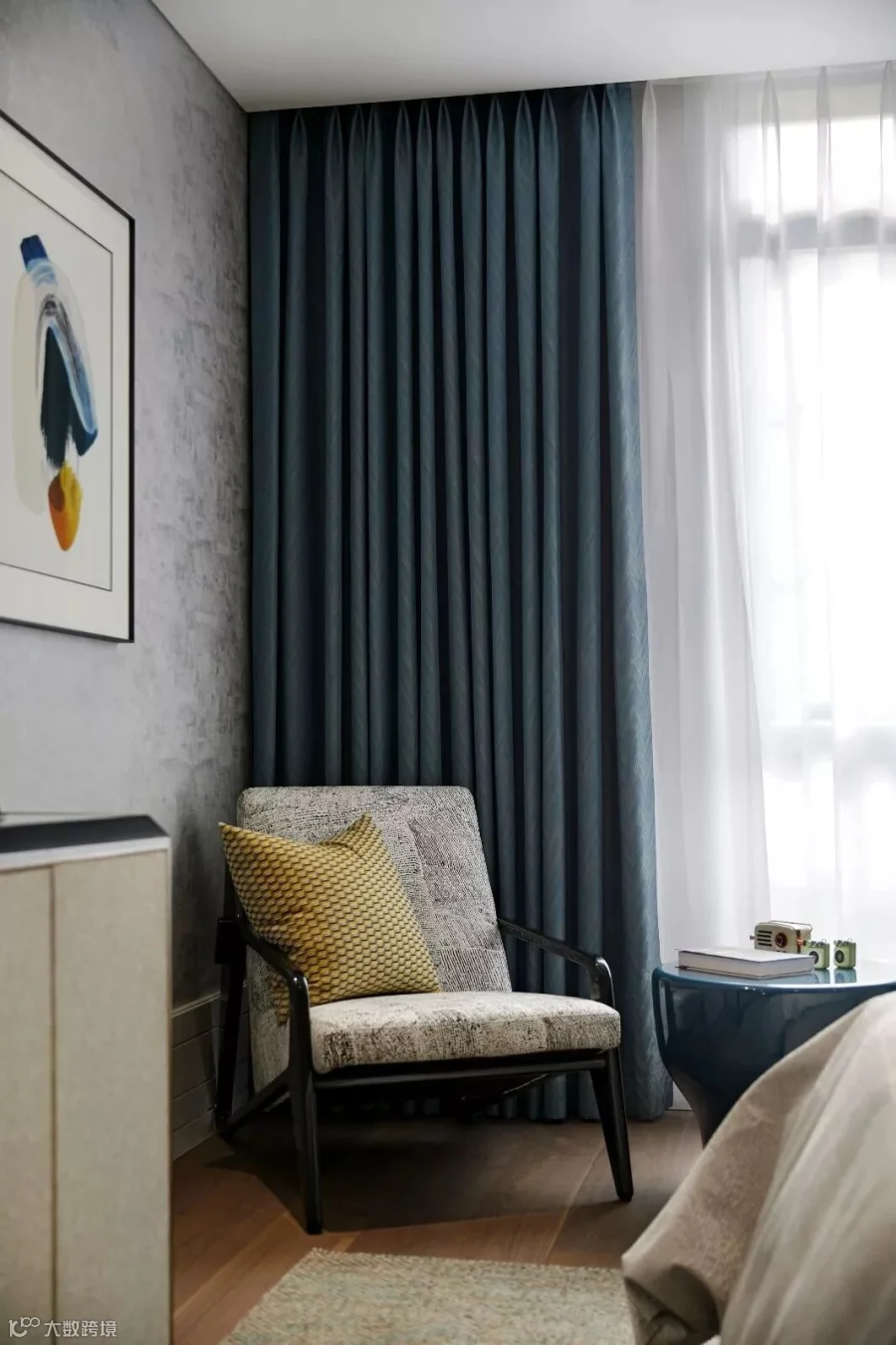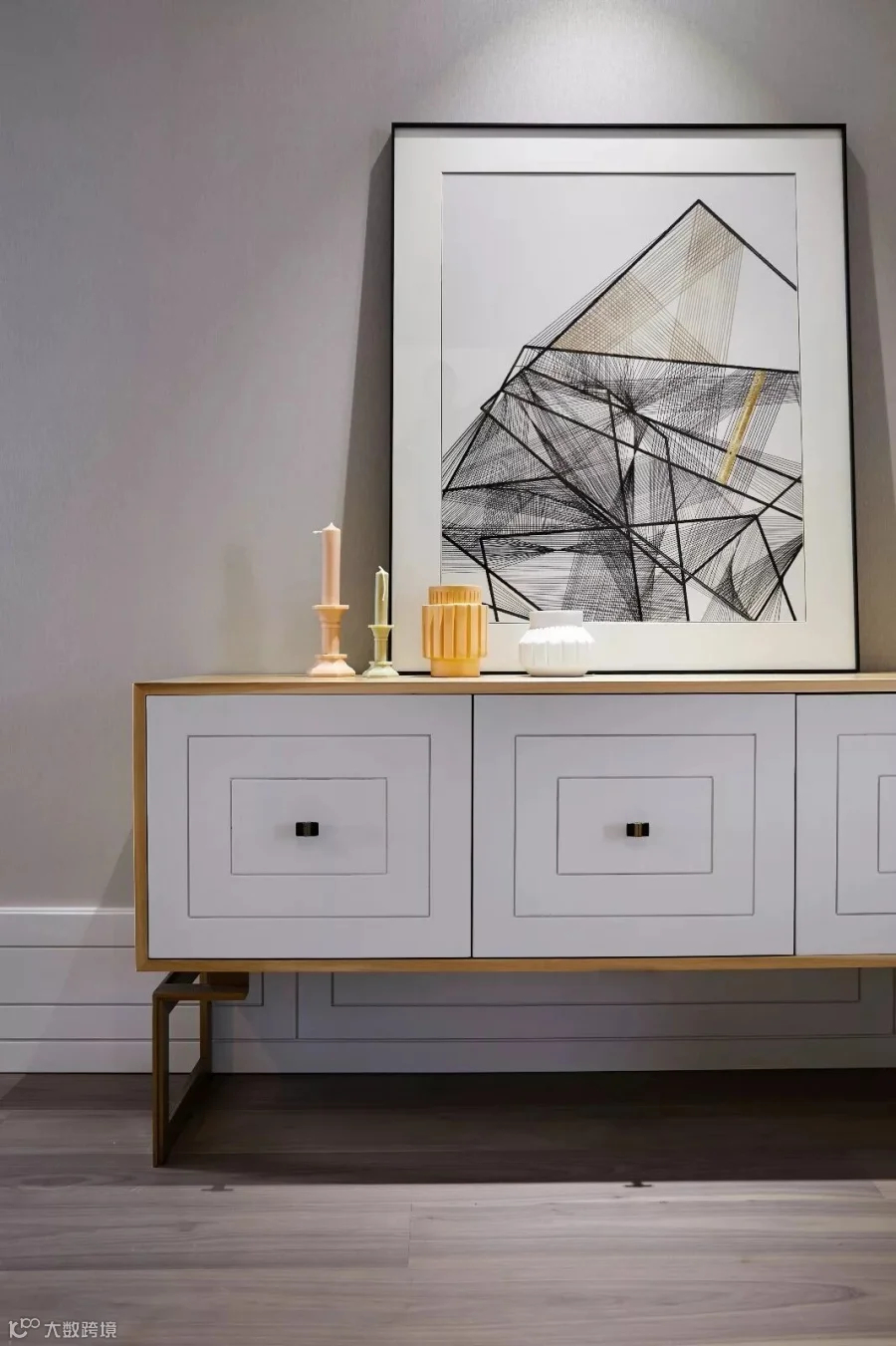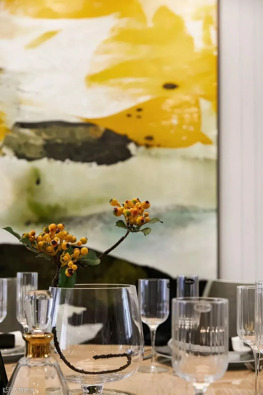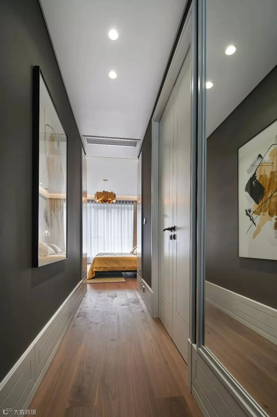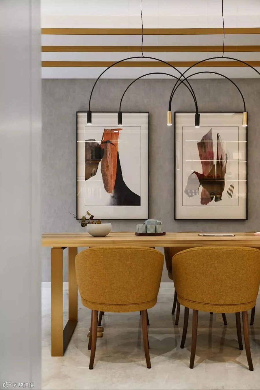 设计师将“雅奢”作为客餐厅设计的格调核心,以现代灰与白为主色基调,以木质的温润为气氛内核,用光线和家具、陈设的点缀使其焕发出艺术生命力。美院青年艺术家的油画,设计师为这个家原创设计的餐边柜,佐以明黄、浅金、宝蓝、柔粉、曜黑的色彩点缀和美陈,让开放的空间呈现出丰富的层次。