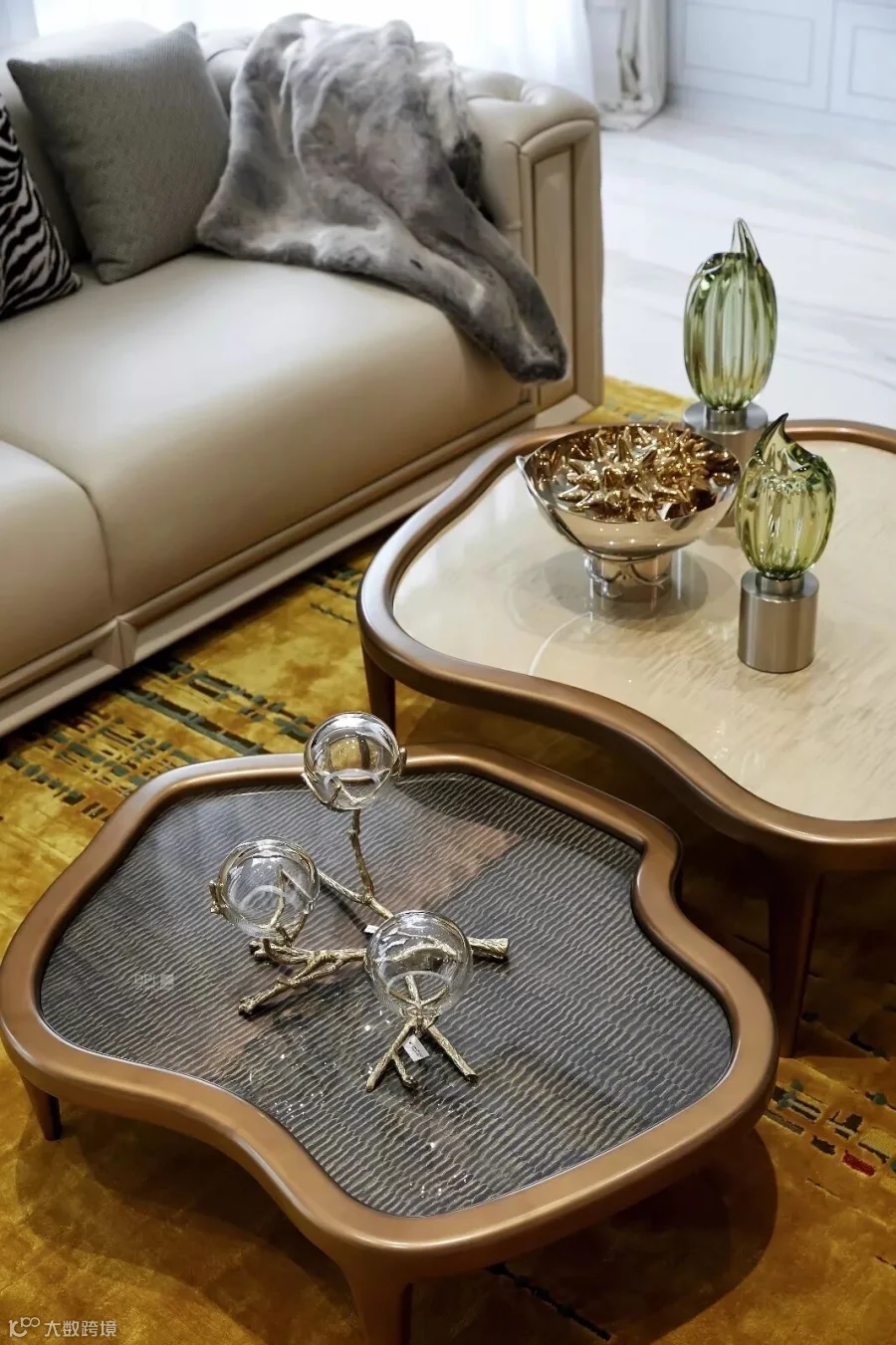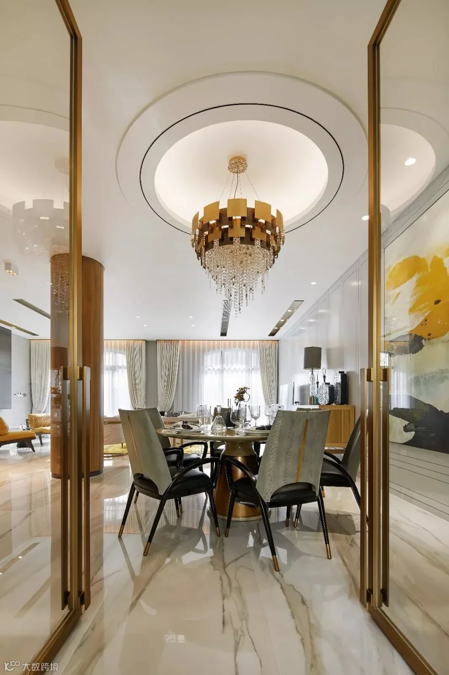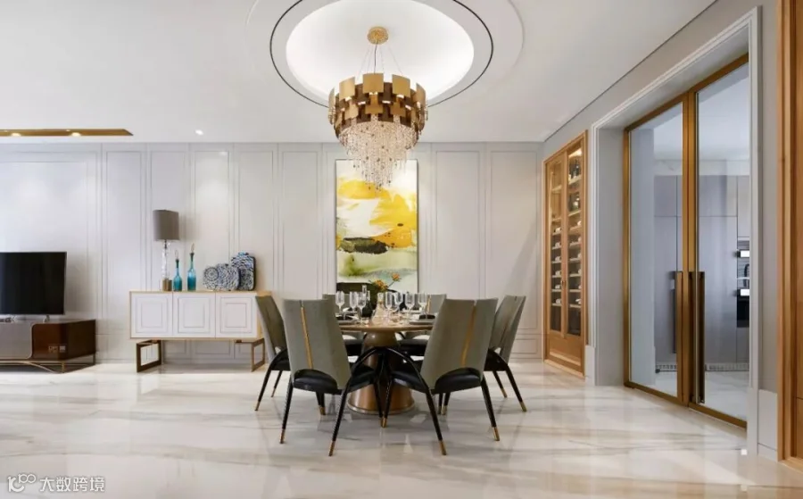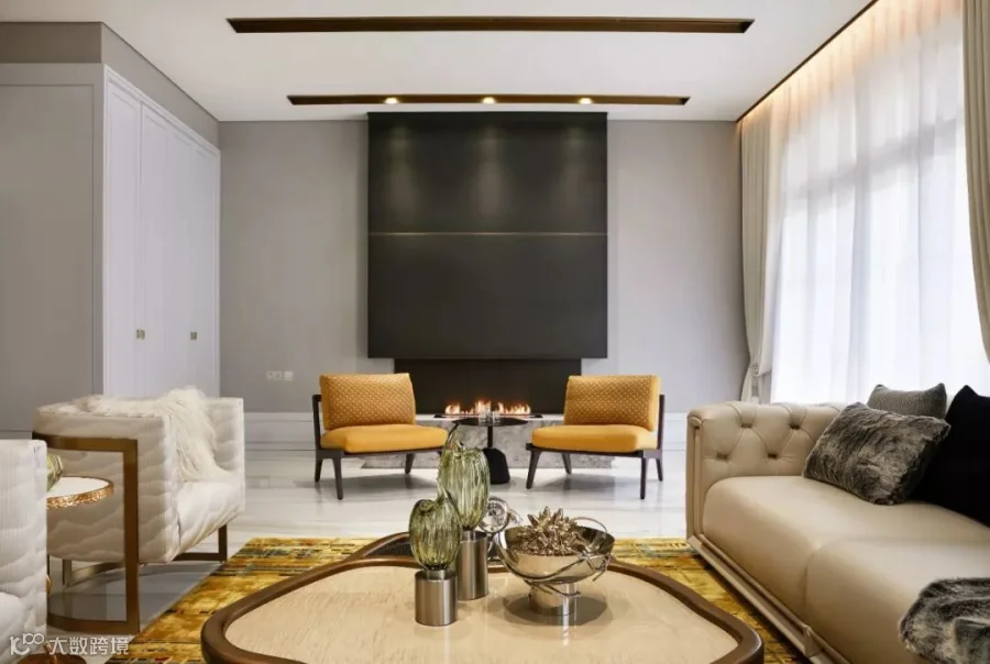 大尺度的落地窗开合有度,美好的阳光照进室内,金丝卡拉卡塔铺贴的地面上荡漾微光,定制的地毯色泽鲜明,与富有艺术感的家具和灯饰交相辉映。沙发的柔软,原木的温润,金属的华贵,水晶的璀璨、香氛的甜美、音乐的共鸣……空间不仅是视觉的,更是人的五感可以感受和触摸的。