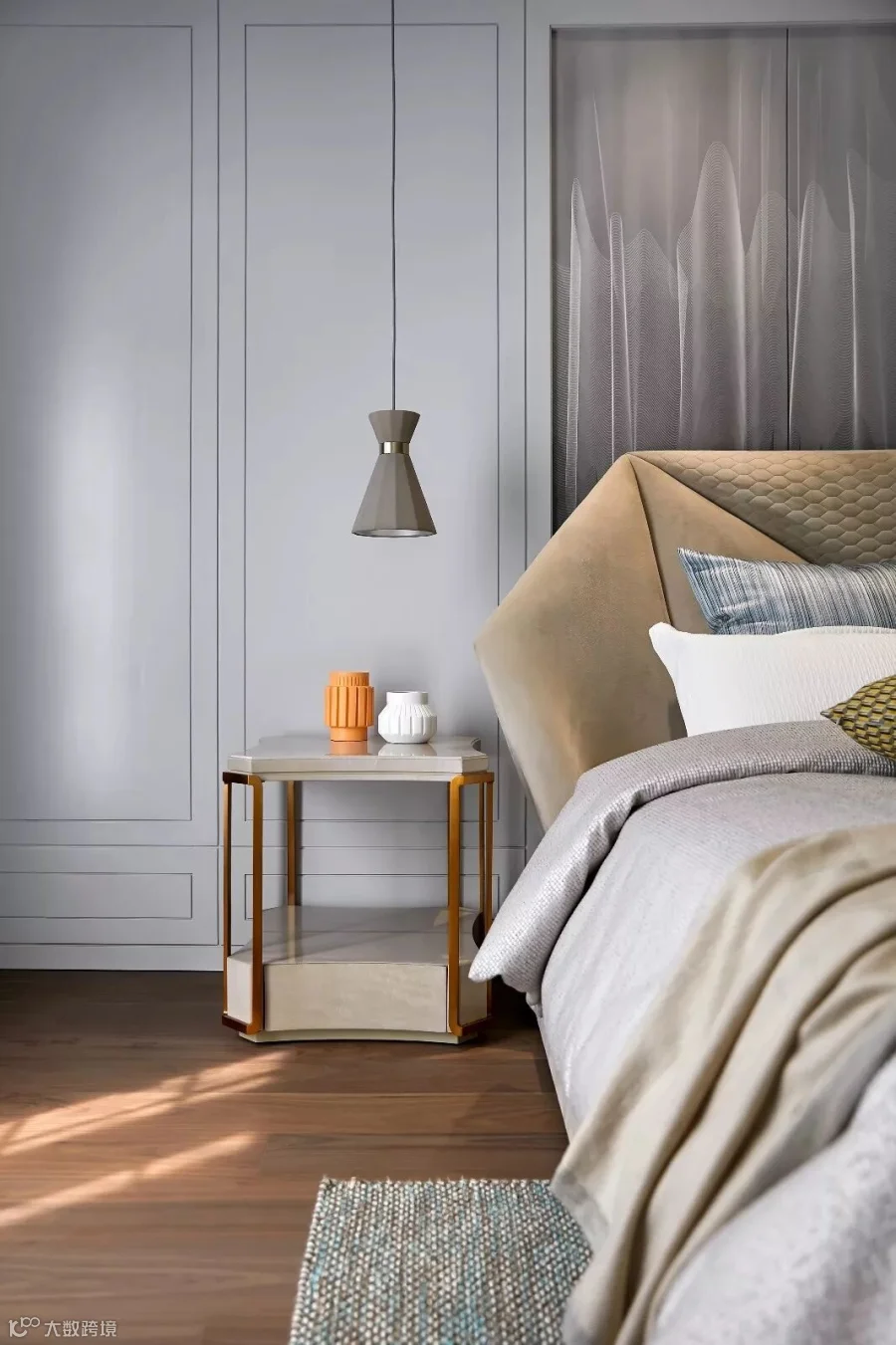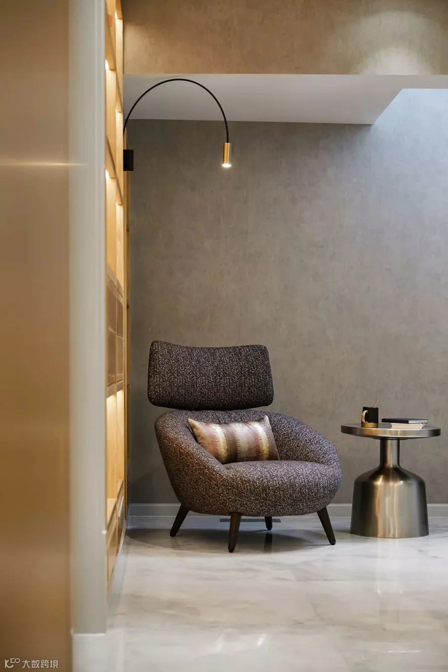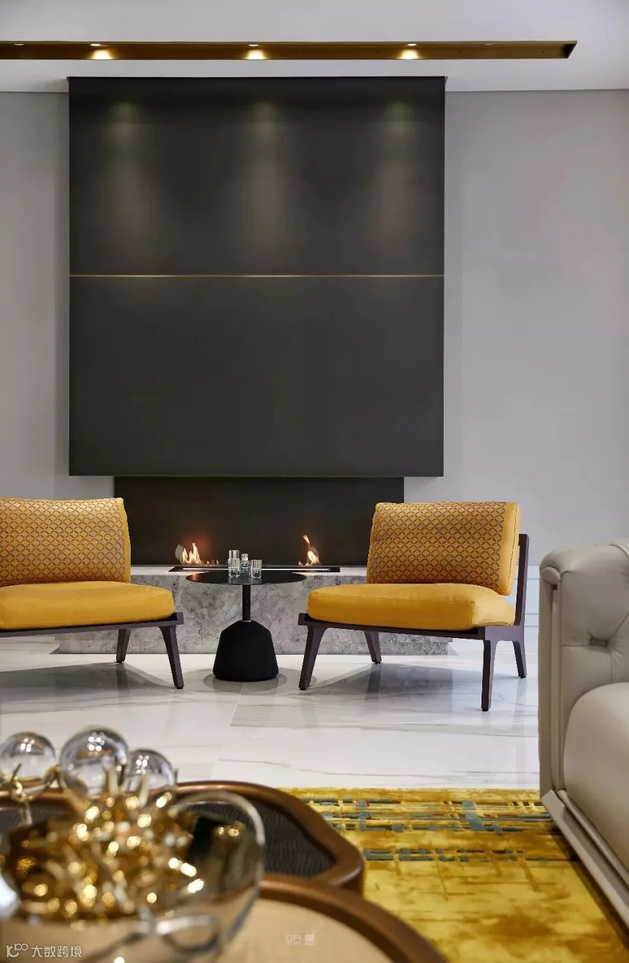 大尺度的落地窗开合有度,美好的阳光照进室内,金丝卡拉卡塔铺贴的地面上荡漾微光,定制的地毯色泽鲜明,与富有艺术感的家具和灯饰交相辉映。沙发的柔软,原木的温润,金属的华贵,水晶的璀璨、香氛的甜美、音乐的共鸣……空间不仅是视觉的,更是人的五感可以感受和触摸的。