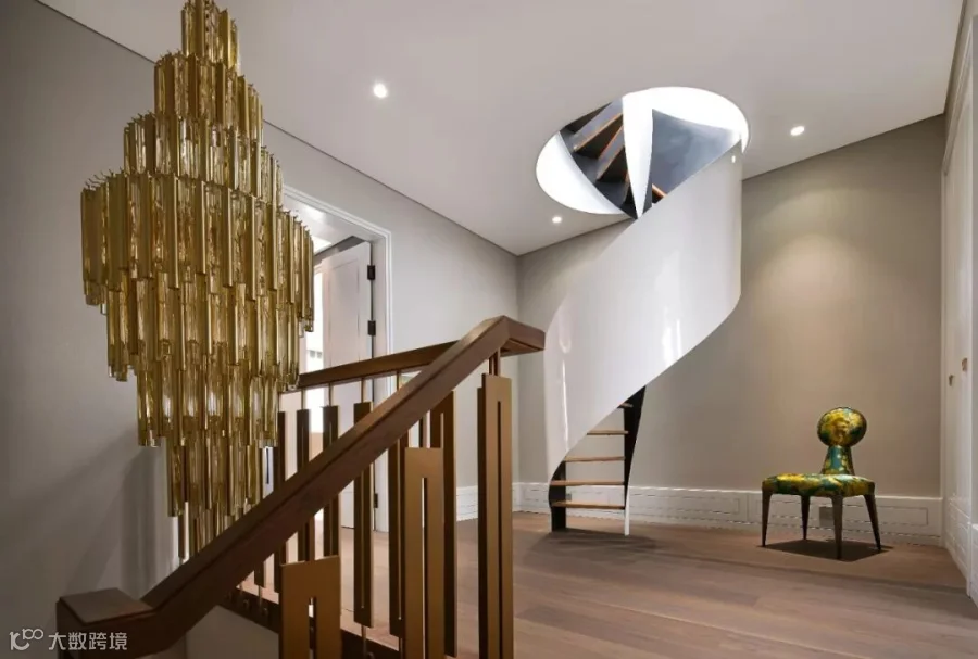 古波斯作家萨迪于《蔷薇园》中有言,“凡是心中所喜欢的,看来总是最美”。女主人喜欢旋转楼梯,于是设计师在主卧门口设计了一部白色的旋转楼梯,聘婷而上,风姿绰约,这既通往四楼阳光房的功能设计,也是一个唯美的艺术装置。而在”她“身边,一张绿绸绣花面的单椅默默陪伴,无声述说着家的真意:陪伴,就是最长情的告白。