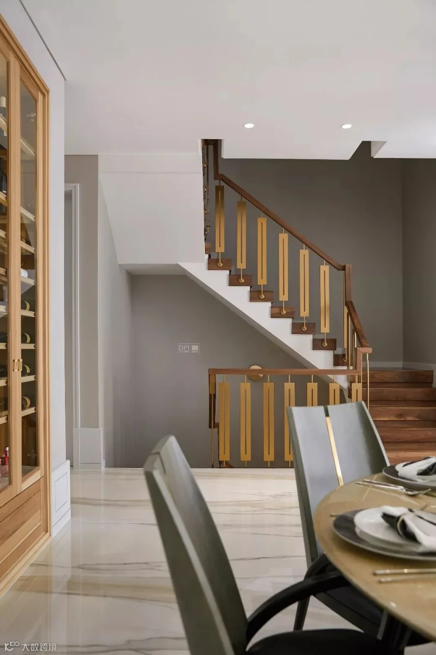 地下一楼是主人从车库回家的第一个空间,空间以浅蓝灰壁纸做底,独特的顶面造型与金属勾边和杨木制的书柜、家具彼此呼应,形成的绝妙调和感。矩形几何元素在木作和黄铜拉丝扶手上都有运用,成为贯穿整个设计的线索之一。地下室靠墙一道自然光线的引入,模糊了地上与地下的界限,坐在书柜前的单椅上,可以就着灯阅读手中的诗集,也可以抬头看四时变化、树影婆娑。