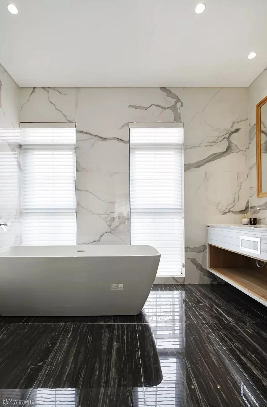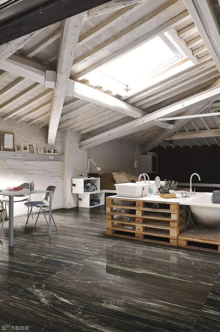 作品选用意大利REX瓷砖金丝卡拉卡塔、特级雪花白、黑曜石三大产品:金丝卡拉卡塔、特级雪花白均源自卡拉卡塔山尤为经典的石纹组合,高贵的白色、纯正的黑色、奢华的金色优雅动人,营造极富雅奢美学风尚的家居空间;黑曜石流线型的石纹融合纯粹的黑色,赋予人居环境尊贵典雅的装饰内涵。