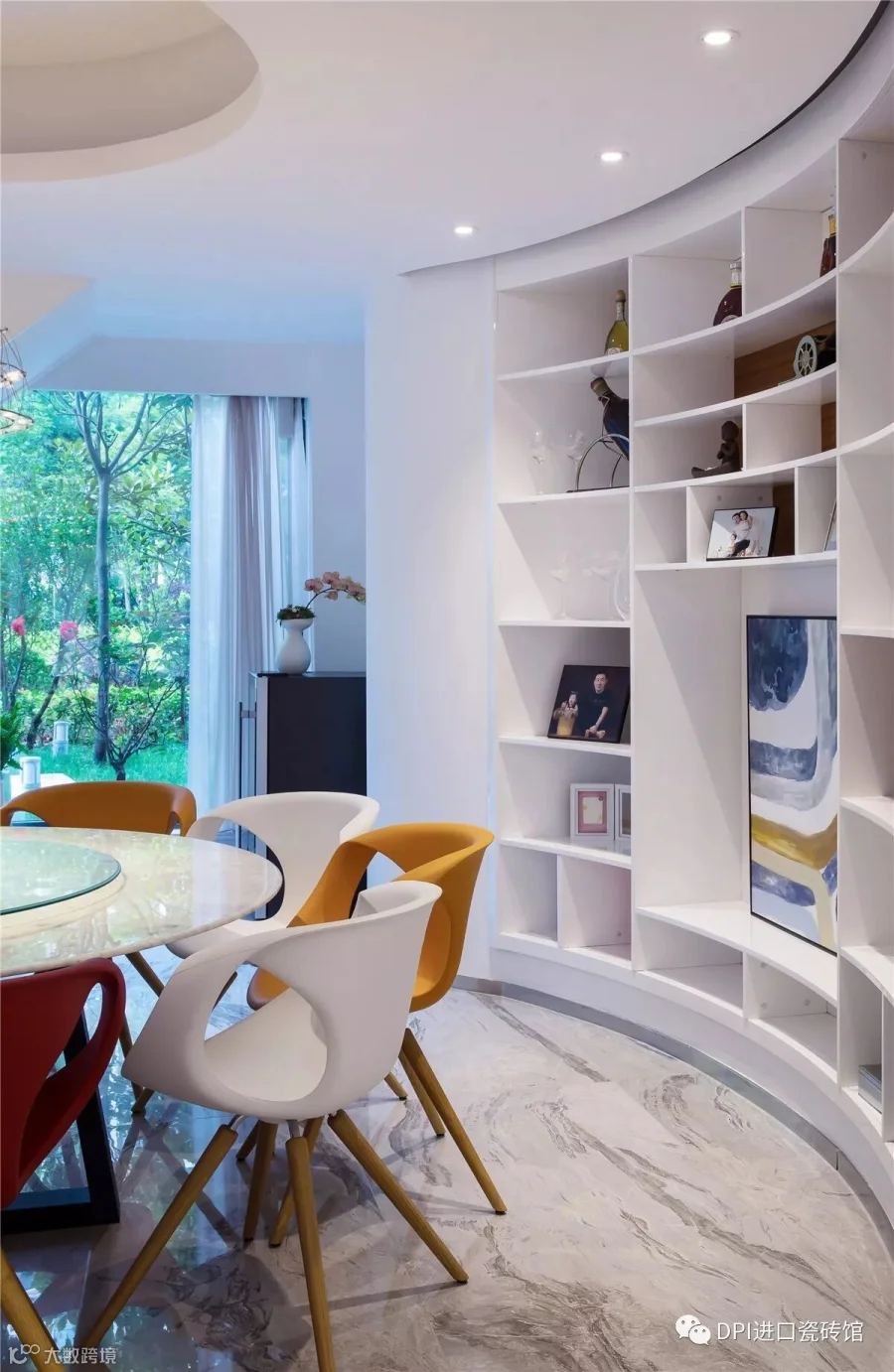 在家具与灯具选样性上犹如画布添彩,沙发选用与墙面流线型呼映的弧形米色arflex,客厅里妖娆盛放的是经busnelli红色s型躺椅,个性潮流,极简轻奢,兼顾舒适。
