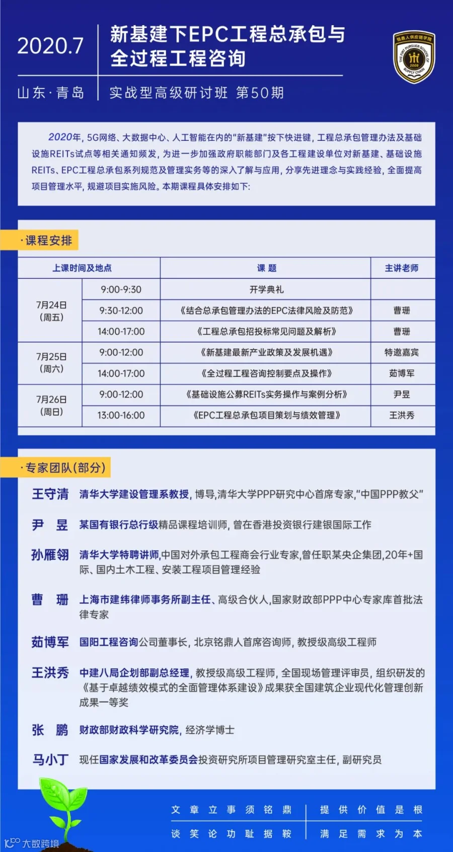 各位同学,您好!《新基建下EPC工程总承包与全过程工程咨询实战型高级研讨班 第50期》,定于2020年7月24日-26日开课。请您合理安排时间,提前联络教务老师。