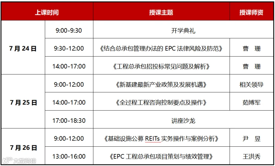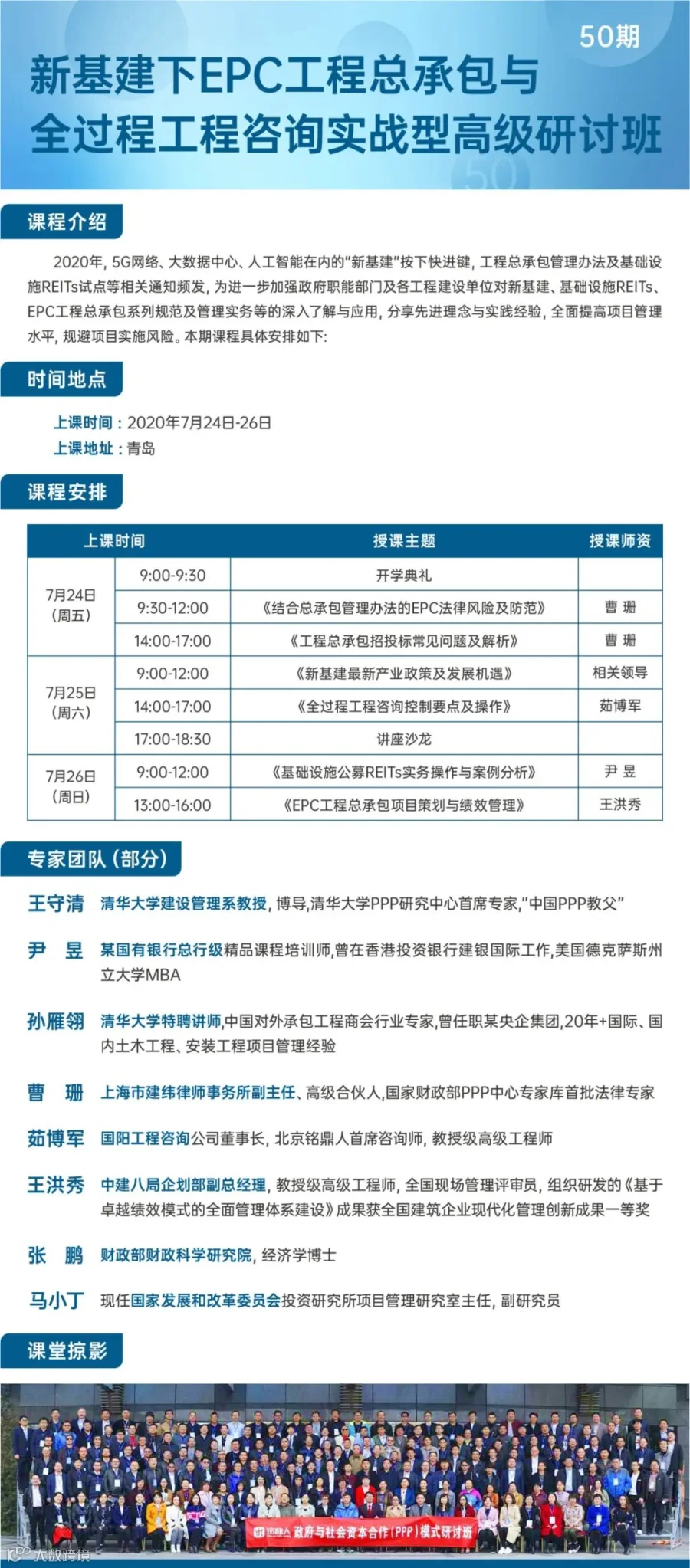 各位同学,您好!《新基建下EPC工程总承包与全过程工程咨询实战型高级研讨班 第50期》,定于2020年7月24日-26日开课。请您合理安排时间,提前联络教务老师。