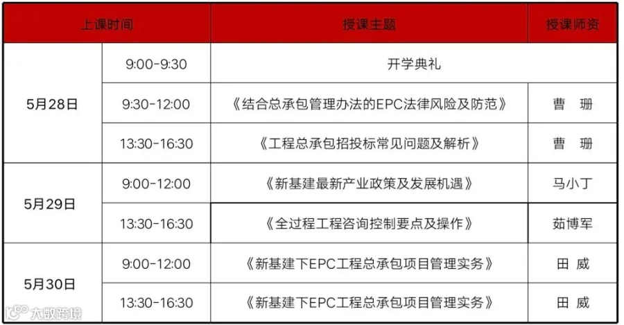 各位同学,您好!《新基建下EPC工程总承包与全过程工程咨询实战型高级研讨班 第59期》,定于2021年05月28日-30日开课。请您合理安排时间,提前联络教务老师,按时上课。