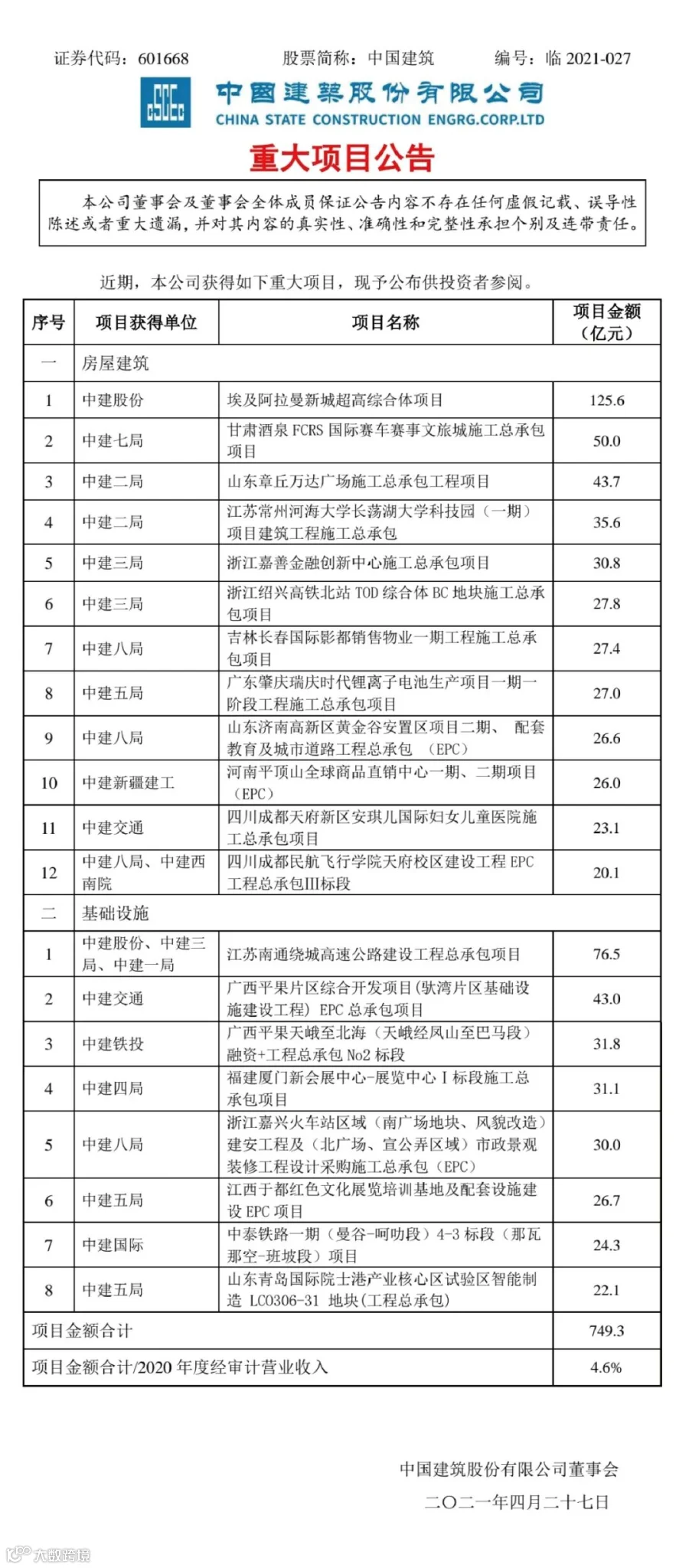 所有项目金额合计749亿元,项目金额合计/2020年度经审计营业收入的4.6%