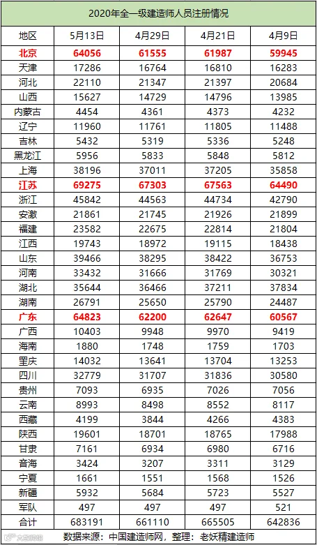 截止到5月13日,全国一级建造师的注册总量已经接近70万,达到68.3万。