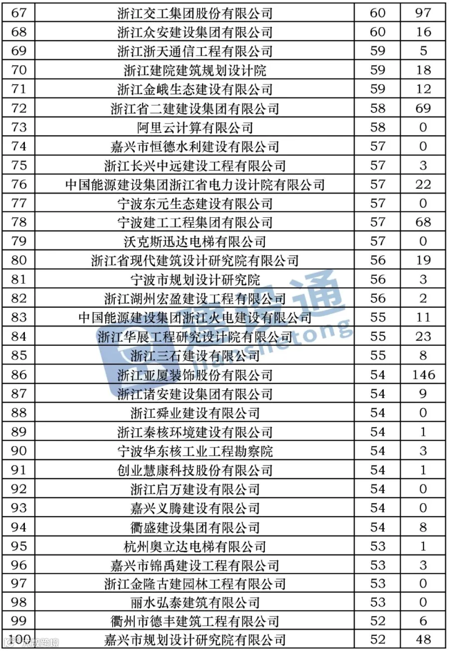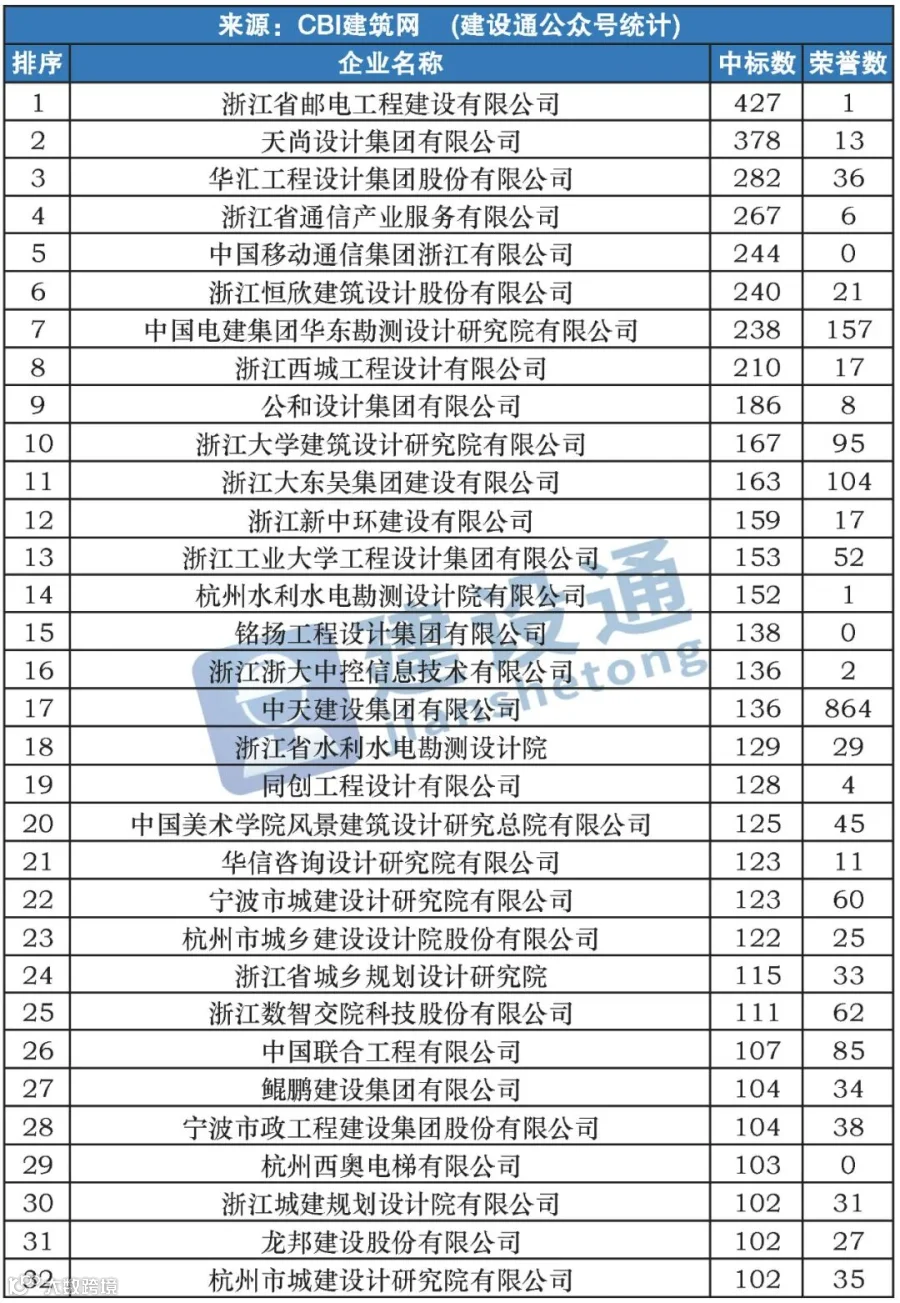 CBI建筑网综合报道:在2020年,浙江建筑施工企业中标数量达86783项,同比(与去年同期)上升7.43%。其中,浙江省邮电工程建设有限公司、天尚设计集团有限公司、华汇工程设计集团股份有限公司分列中标数量排行榜前三位。