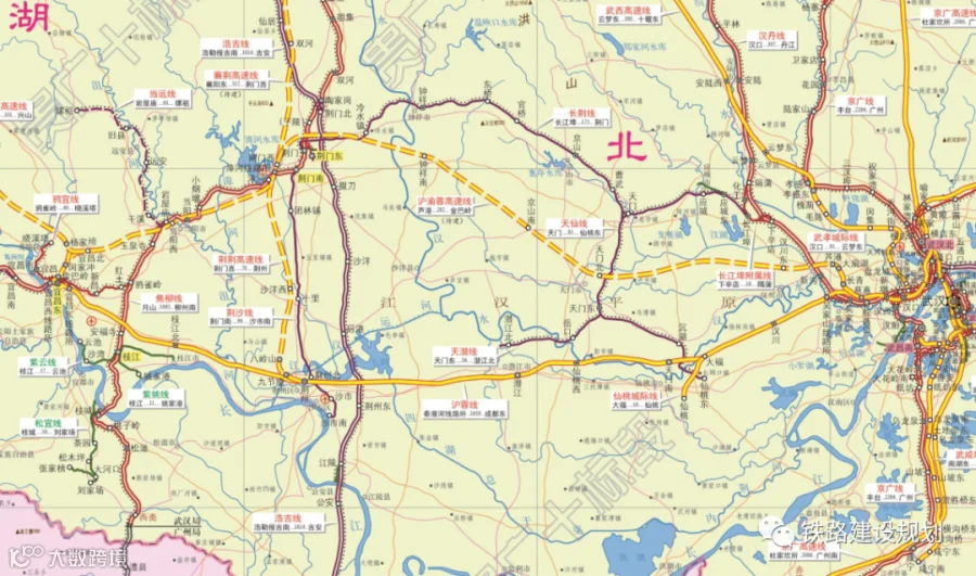 沿江高铁武汉至宜昌段,线路起自汉口站,利用汉宜铁路17.9公里设线路所新建线路向西,预留芦港线路所正线与合肥至武汉段贯通,经汉川、天门、钟祥、荆门至宜昌,接入宜昌至郑万高铁联络线闵家冲线路所。