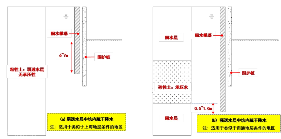 3、帷幕深度:对于仅需坑内疏干降水的基坑,软土地区粘性土弱透水层中隔水帷幕深度应控制在基坑基底以下6~7m即可(如上海地区项目);若遇粉性、砂性土等(较)强透水层,且含水层厚度适中、底埋深不深,可考虑帷幕隔断该含水层(如南通、武汉沿江地区);若基坑基底承压水稳定性不满足要求需降承压水,且承压含水层厚度不厚、层底埋深不深,隔水帷幕也应尽量隔断承压含水层,以减少降压降水对周边环境的沉降影响;