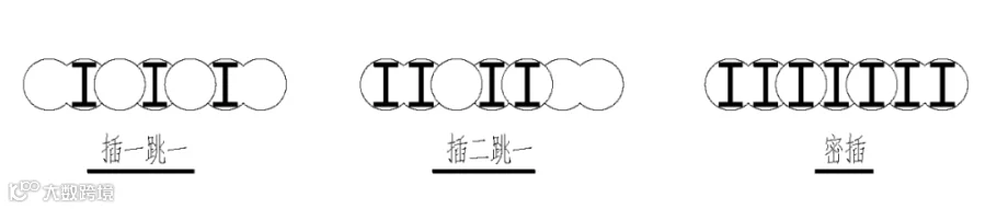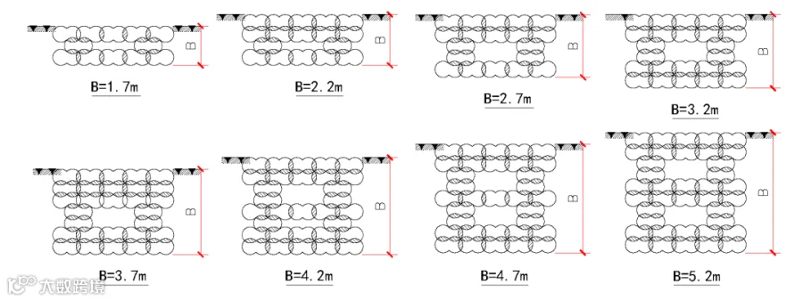 3、水泥土搅拌桩应按格栅布置,建议格栅布置形式如图所示(以双轴为例)。