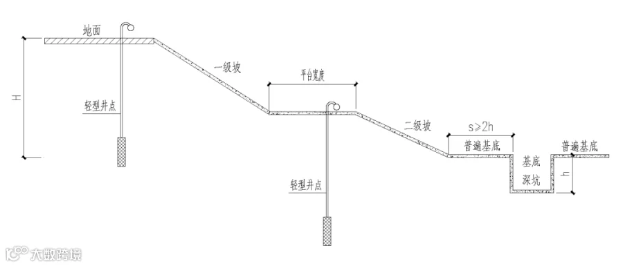 图 2 多级放坡示意(注:开挖面在地下水位之下需要设置降水井)