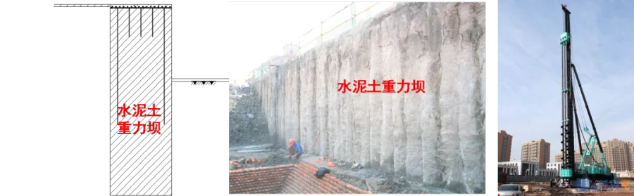 1、重力式挡墙形式:一般选用双轴或三轴水泥土搅拌桩,搅拌桩可按搭接施工,搭接长度控制在150mm~200mm,挡墙顶面宜设置混凝土面板;
