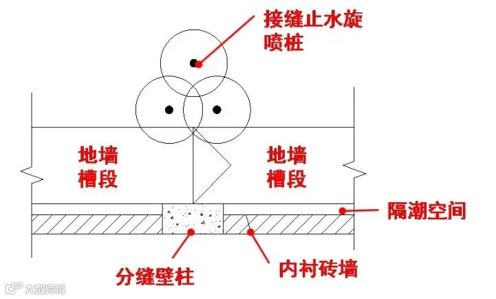 4、地墙槽段施工槽段外侧可设置高压旋喷桩进行接缝加强止水,墙内侧应设置扶壁柱、排水沟结合构造砌体墙的防渗构造措施。